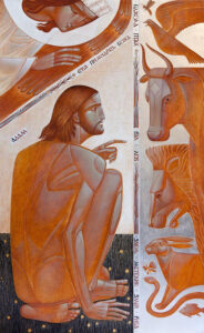 Ο ζωγραφικός πίνακας που πλαισιώνει τη σελίδα ("Ο Αδάμ ονομάζει τα ζώα", 2015) είναι έργο της, ουκρανής, Lyuba Yatskiv.