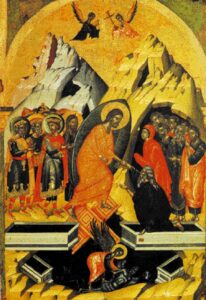 Στο ενδιάμεσο οι Εκκλησίες μας φέρνουν κάθε χρόνο την Ανάσταση και τον Αναστημένο. Είχε κατέβη στον Άδη των αισθημάτων, της ενοχής, της αγωνίας, της χαμέρπειας, της μνησικακίας, του μίσους, της κραιπάλης και τράβηξε έξω το ζευγάρι Αδάμ και Εύα. Στράφηκαν προς τον ουρανό, κατάλαβαν τι σημαίνει κατακόρυφη διάσταση. Ό,τι χαρακτηρίζει την αρχέγονη Πτώση, χαρακτηρίζει ολόκληρο τον κόσμο. Ό,τι χαρακτηρίζει την Ανάσταση αφορά όλους. «Παγγενή τον Αδάμ», λέει. Το γένος των ανθρώπων παρεξέκκλινε, παραστράτησε, μετεωρίζεται και οδυνάται. Αλλά δεν φαίνεται να αναζητά σωτηρία, δεν γυρεύει «εν τοις εγκάτοις χειρουργεία», δεν ζητάει ανάσταση επι γής. Μα εάν δεν ζητήσουν πώς θα κατέλθουν τα «πτερόεντα δώρα», «το άστρον το προωρισμένον να λάμπη εις τας συνειδήσεις, την αύραν, την ικανήν δια να δροσίζη τας ψυχάς, και την ζωήν, την πλασμένην δια να πάλλη εις τας καρδίας»; Χάνεται η Ανάσταση πίσω στο παρελθόν; Έρχεται και φέγγει από το Μέλλον; Μοιάζει με την Βασιλεία που «δεν έρχεται μετά παρατηρήσεως» (Λκ.17,20); «Η βασιλεία η εμή ουκ έστιν εκ του κόσμου τούτου» (Ιω.18,36).