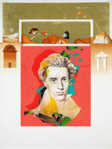 Στην εικαστική πλαισίωση της σελίδας, σύνθεση ζωγραφικού έργου του Γιώργου Δέρπαπα με σχεδίασμα προσωπογραφίας του Σέρεν Κίρκεγκωρ.