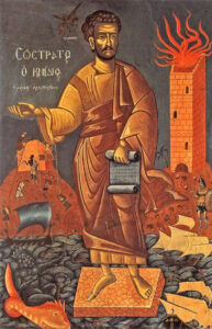 Ο ζωγραφικός πίνακας που συμπληρώνει τη σελίδα ("Σώστρατος ο Κνίδιος, ο μέγας αρχιτέκτων", 1935-40) είναι έργο του Νίκου Εγγονόπουλου.